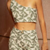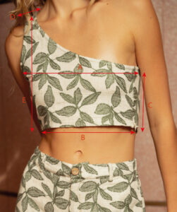 top asimetrico de un solo hombro, con bordado de hojas verdes sobre fondo claro y corte cropped con cierre invisible lateral