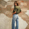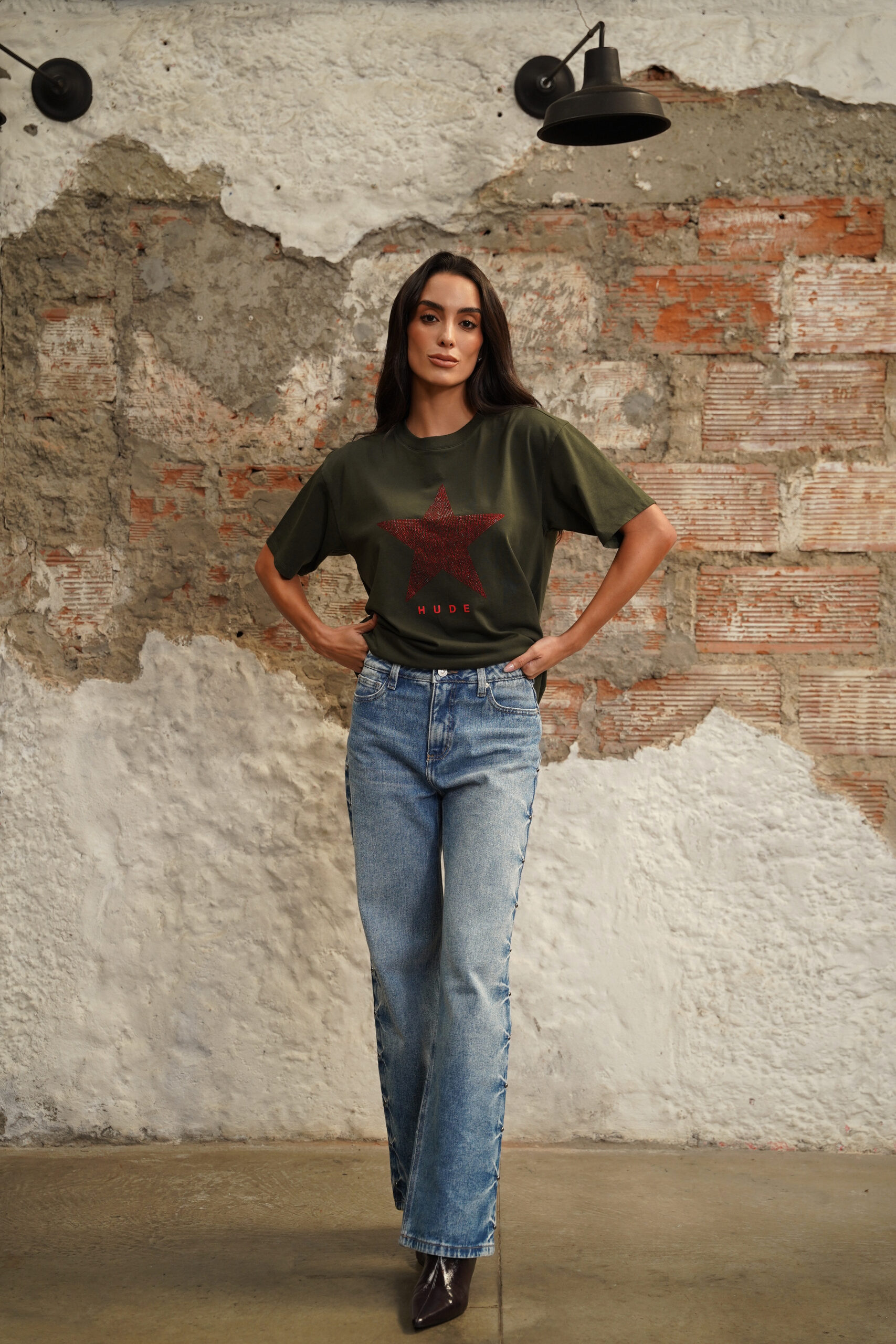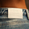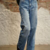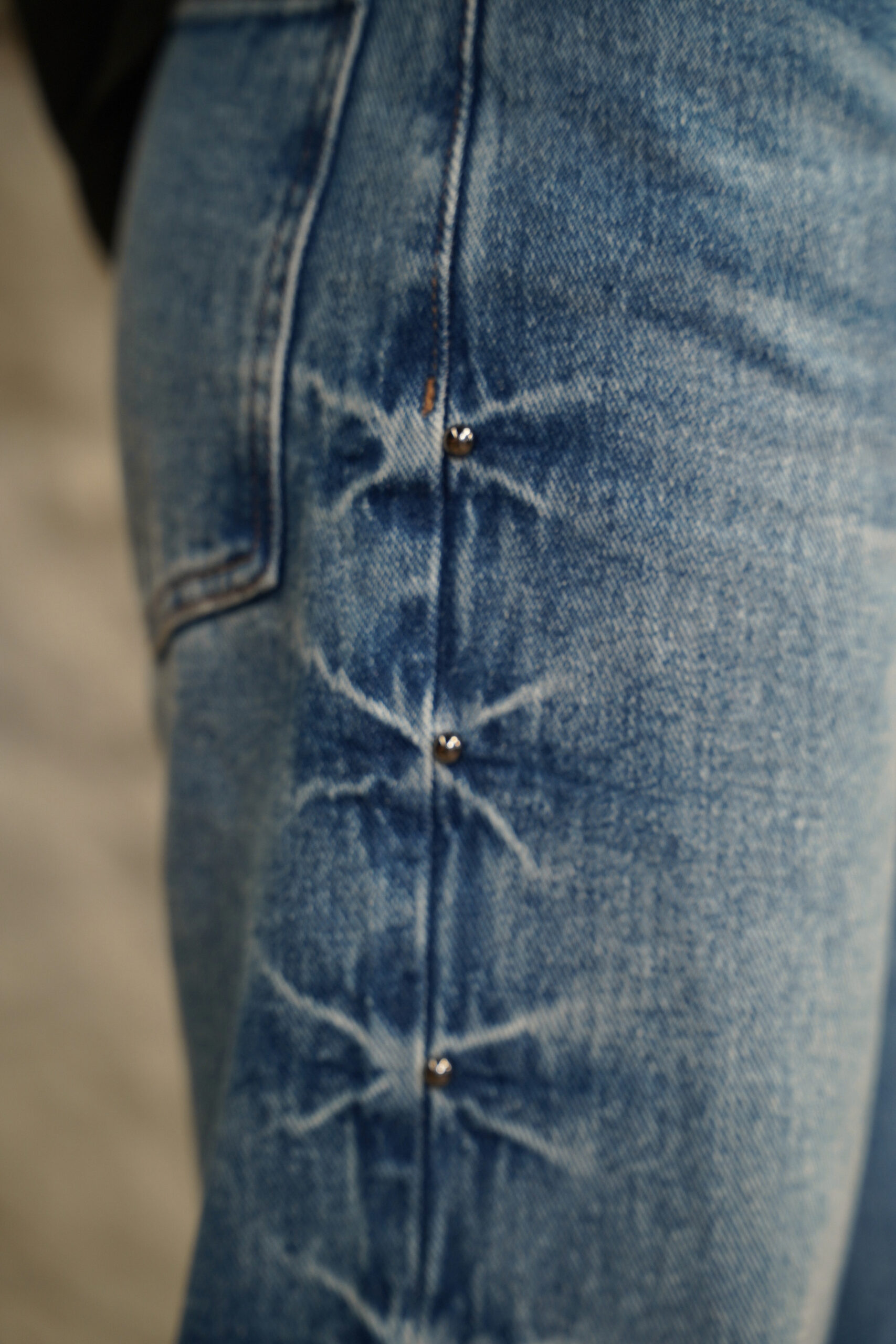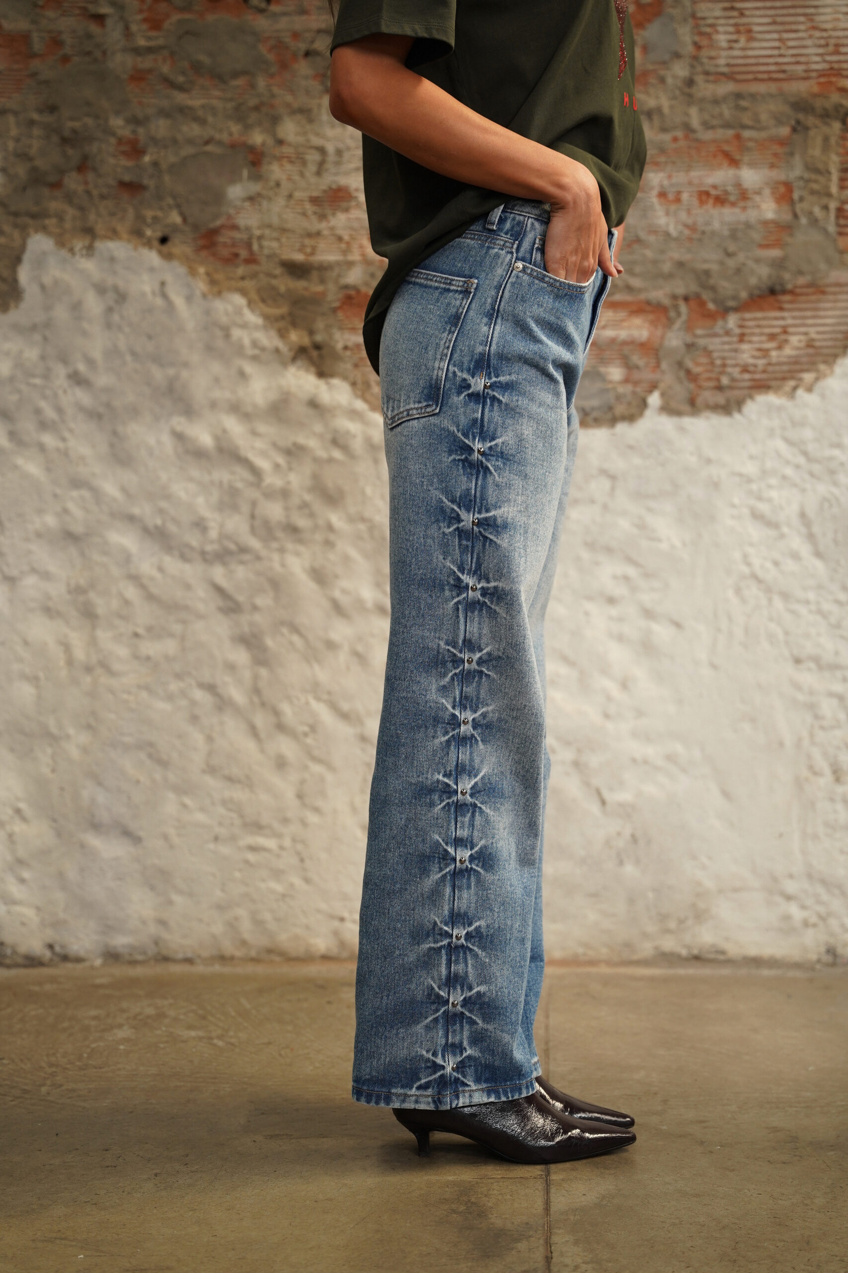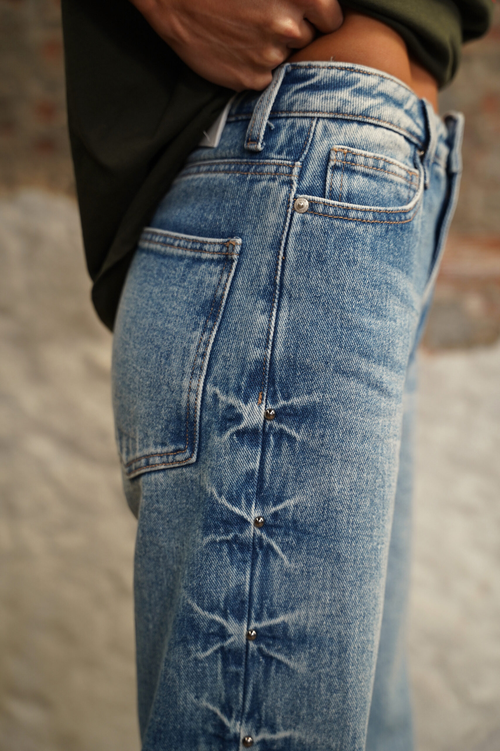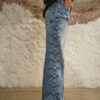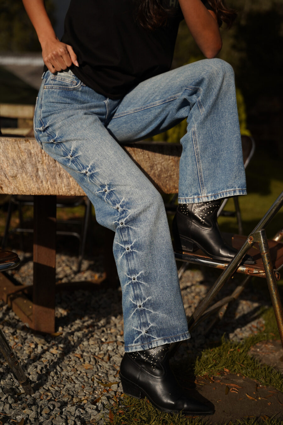 Jean bota ancha de tiro alto confeccionado en denim rígido azul claro, efecto de lavandería y apliques metálicos distribuidos en los laterales, cierre frontal con cremallera y botón metálico
