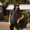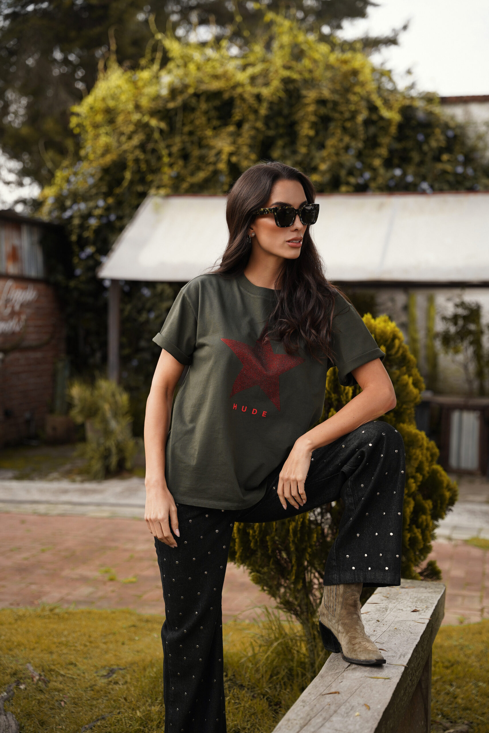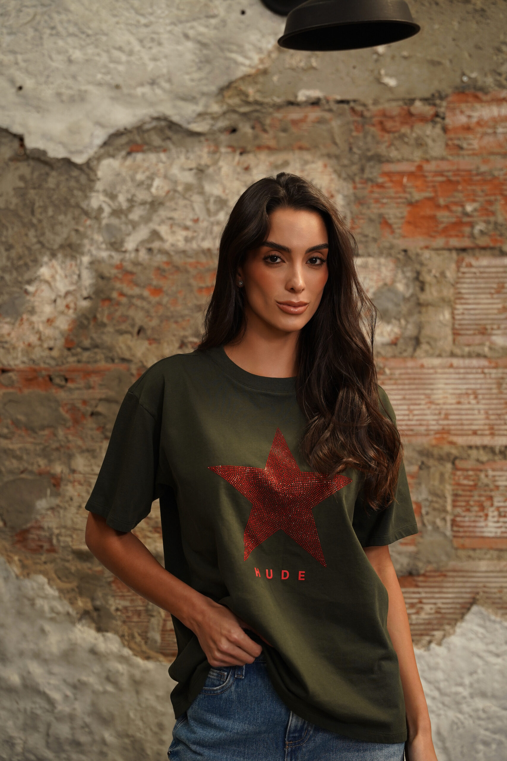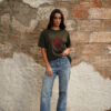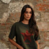 Camiseta en tono verde oscuro, cuello redondo, manga corta, fit amplio, apliques de piedra en forma de estrella color vino y texto estampado en el delantero.