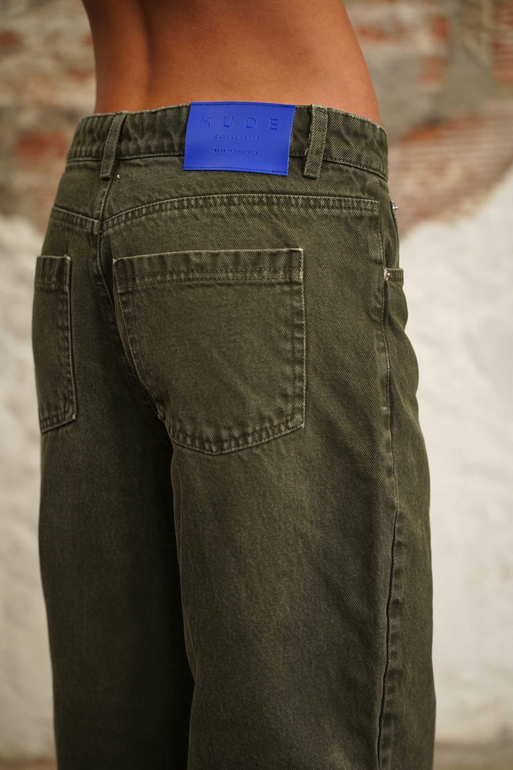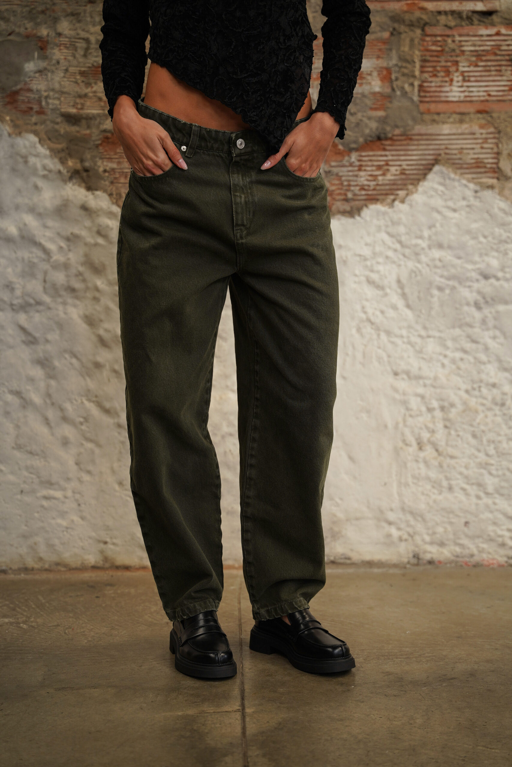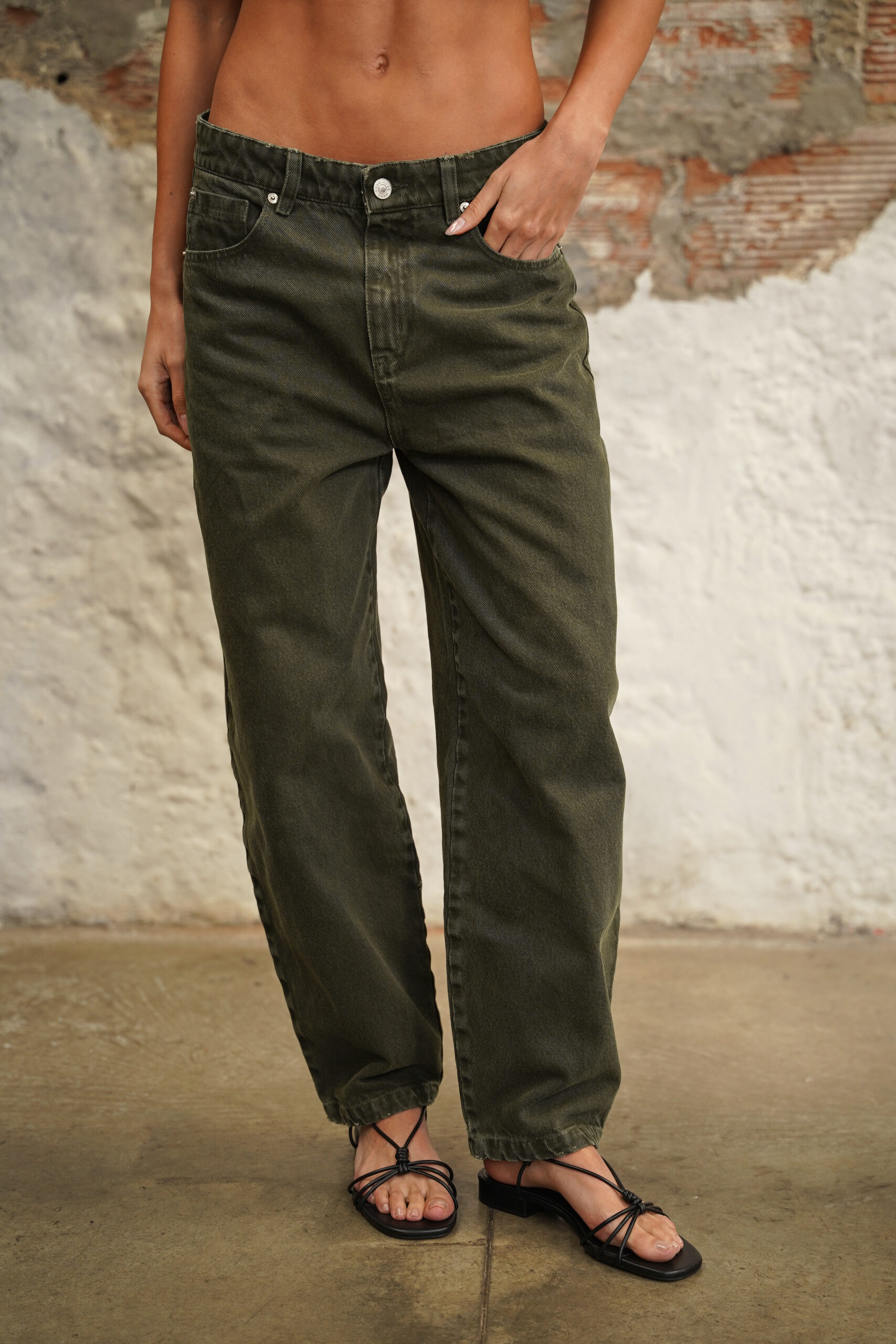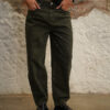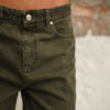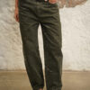 Jean con fit barrel elaborado en denim rígido verde oscuro, pretina tiro medio, fit barrel, pretina con pasadores, cierre frontal con cremallera y botón metálico.
