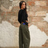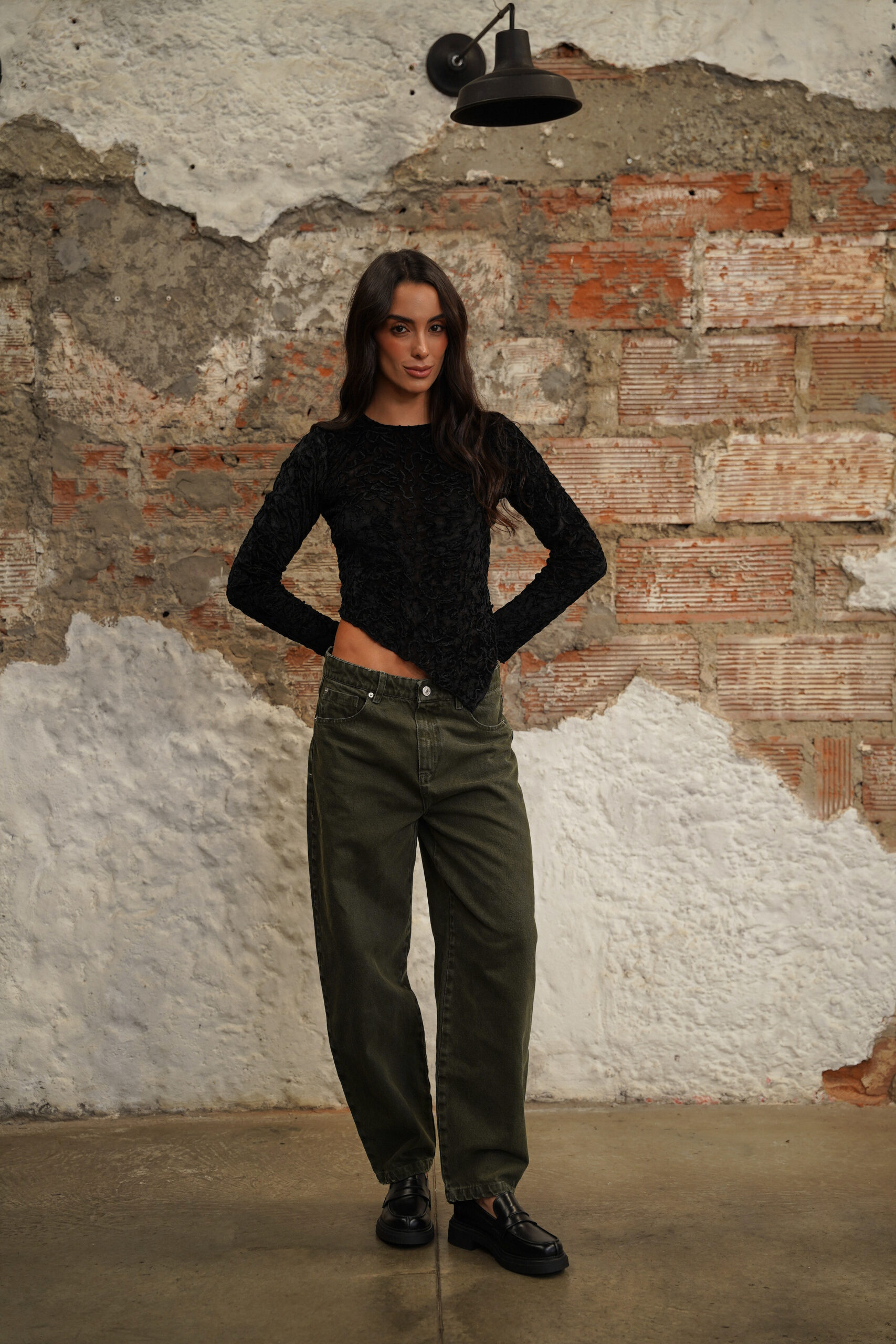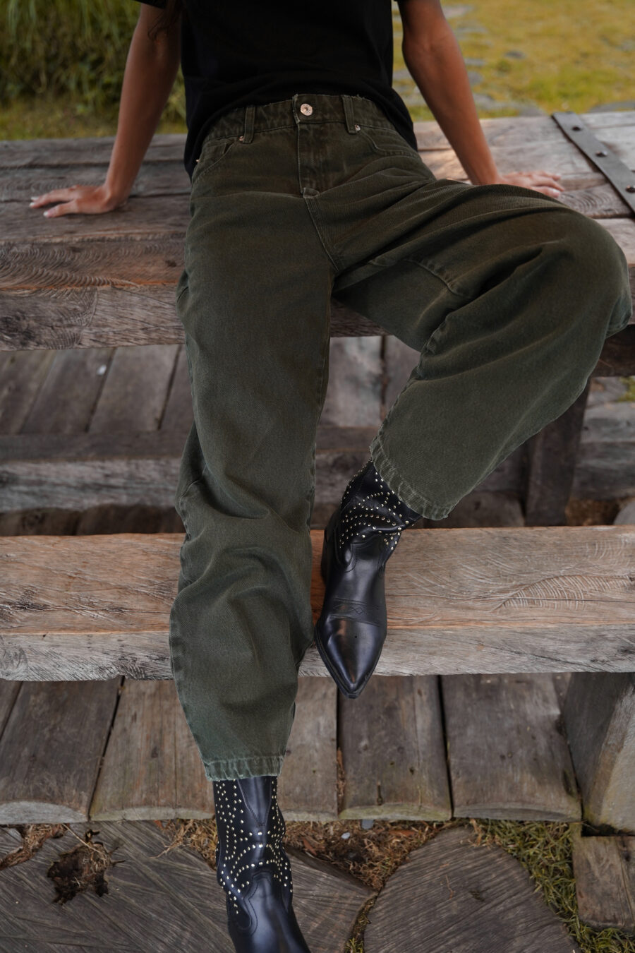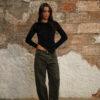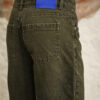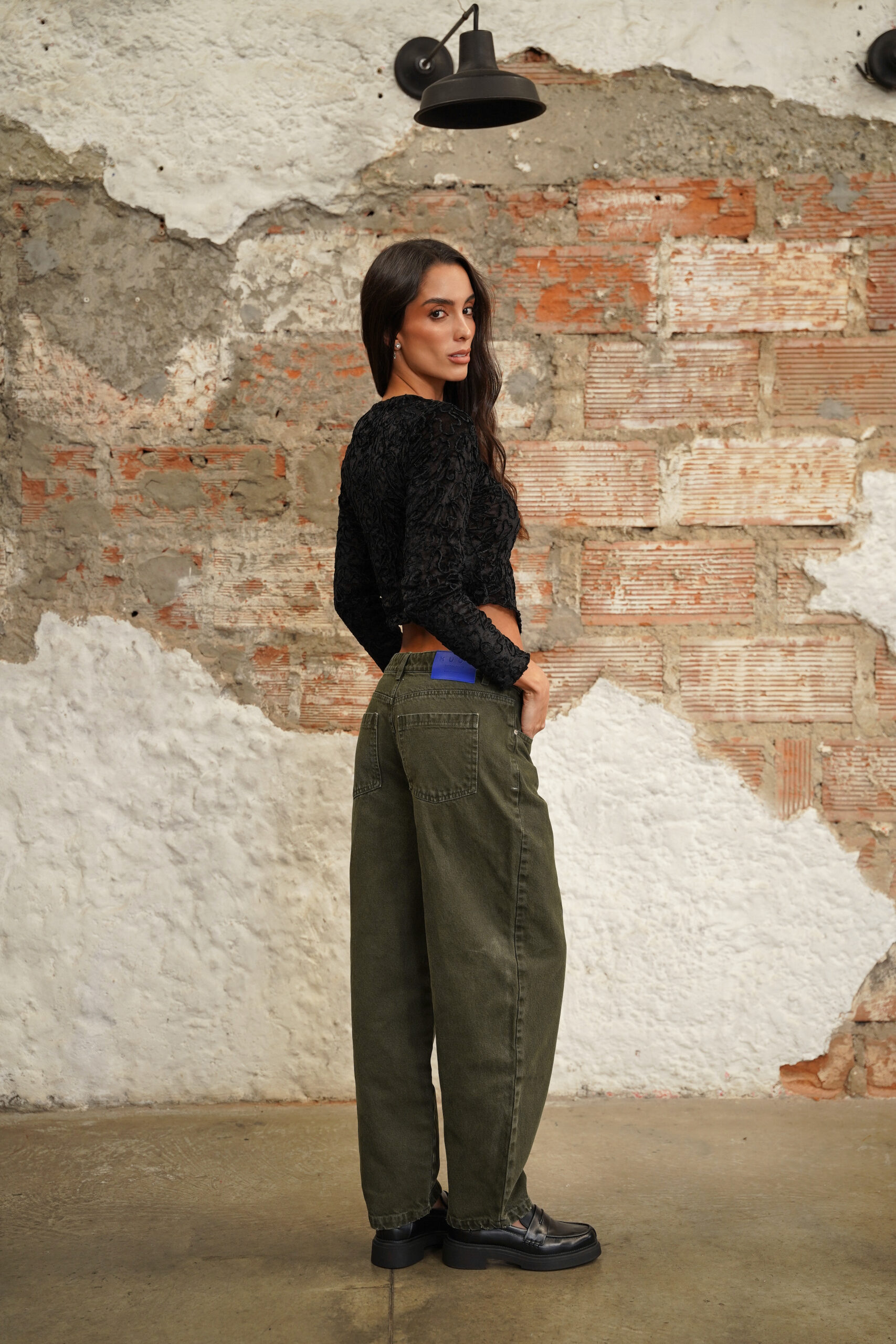 Jean con fit barrel elaborado en denim rígido verde oscuro, pretina tiro medio, fit barrel, pretina con pasadores, cierre frontal con cremallera y botón metálico.