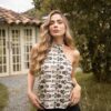 Top halter en tejido beige con bordado negro de motivo floral. Diseño con cuello ajustable y descubierto en espalda y hombros. Silueta fluida con largo regular.