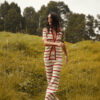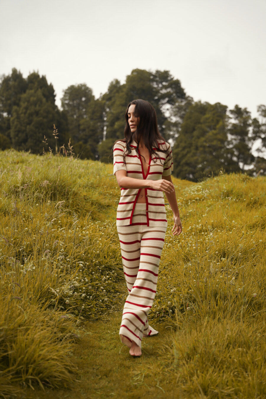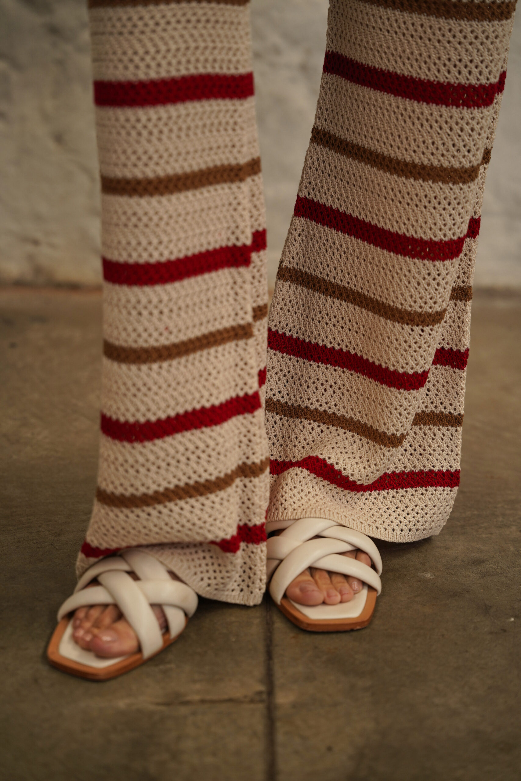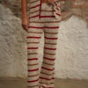 Pantalón tejido tono crema con rayas horizontales en contraste color rojo y café claro, pretina ancha, tiro alto y fit recto con caída fluida