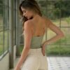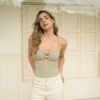 Body color verde claro con tiras delgadas.Diseño con tres aberturas frontales unidas por cuentas de madera color crema. Silueta ajustada y broches en la zona del Panty para ajuste.