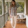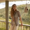 Camiseta tejida oversize con rayas verticales en contraste, manga corta, cuello abierto tipo resort y botones al frente.