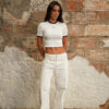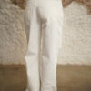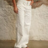 Jean blanco de tiro alto, pierna recta, con proceso de lavandería especial para efecto total sobre el tejido, pretina con pasadores y botón con cierre frontal