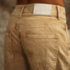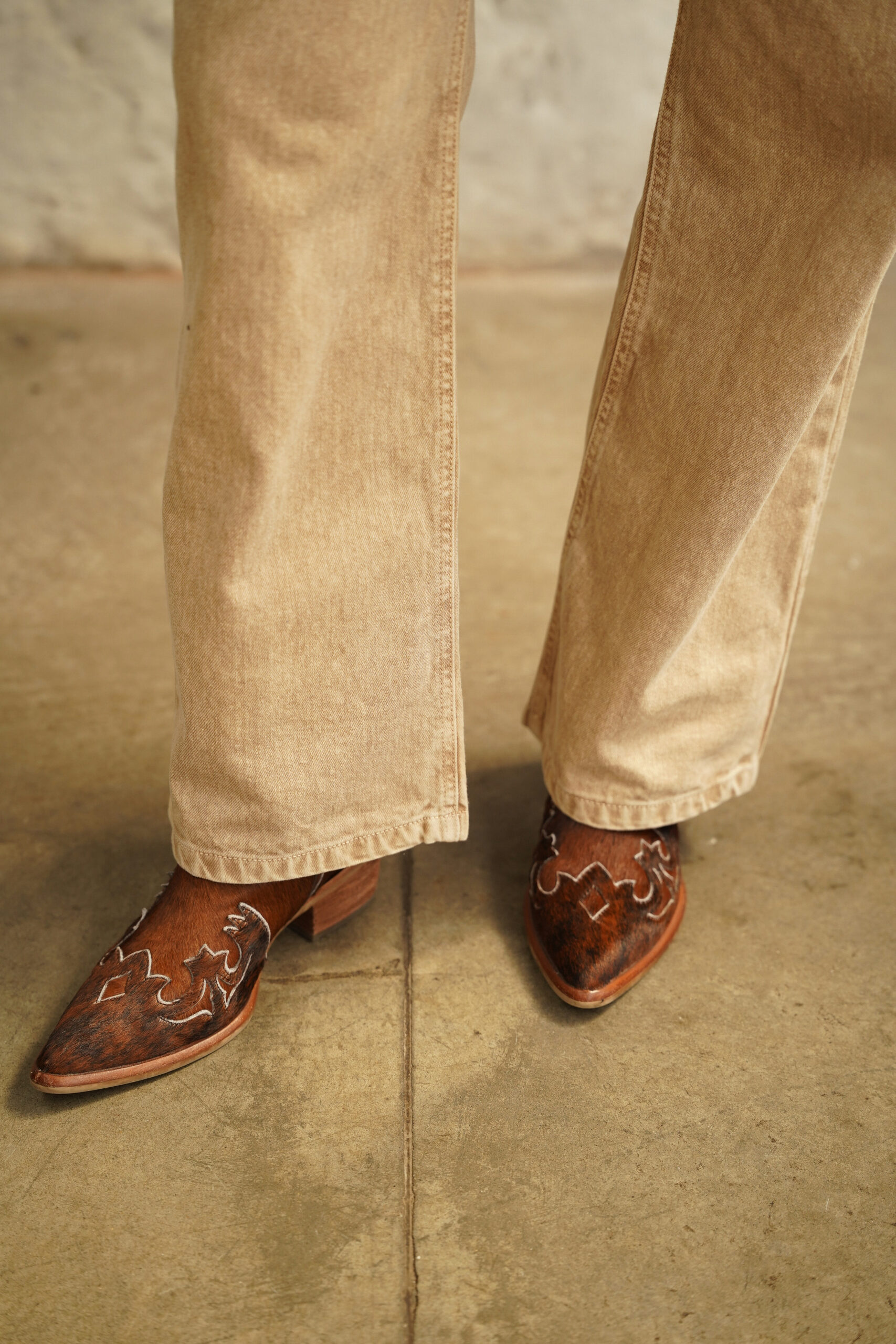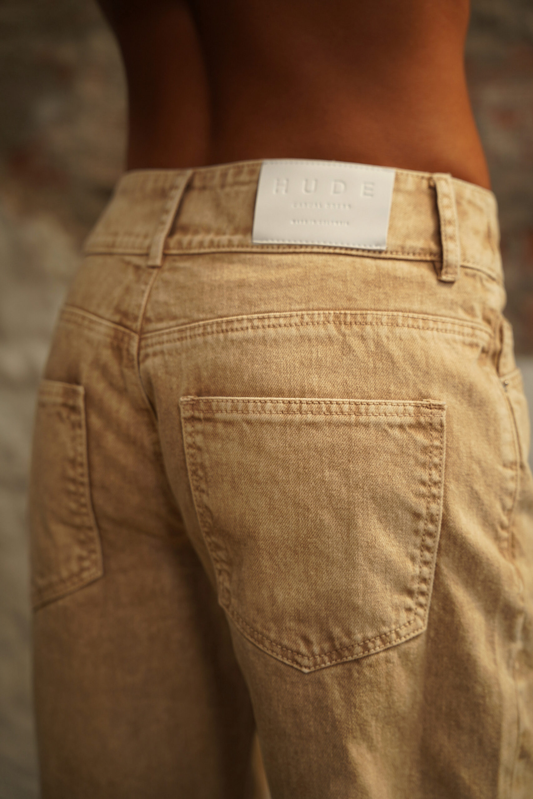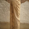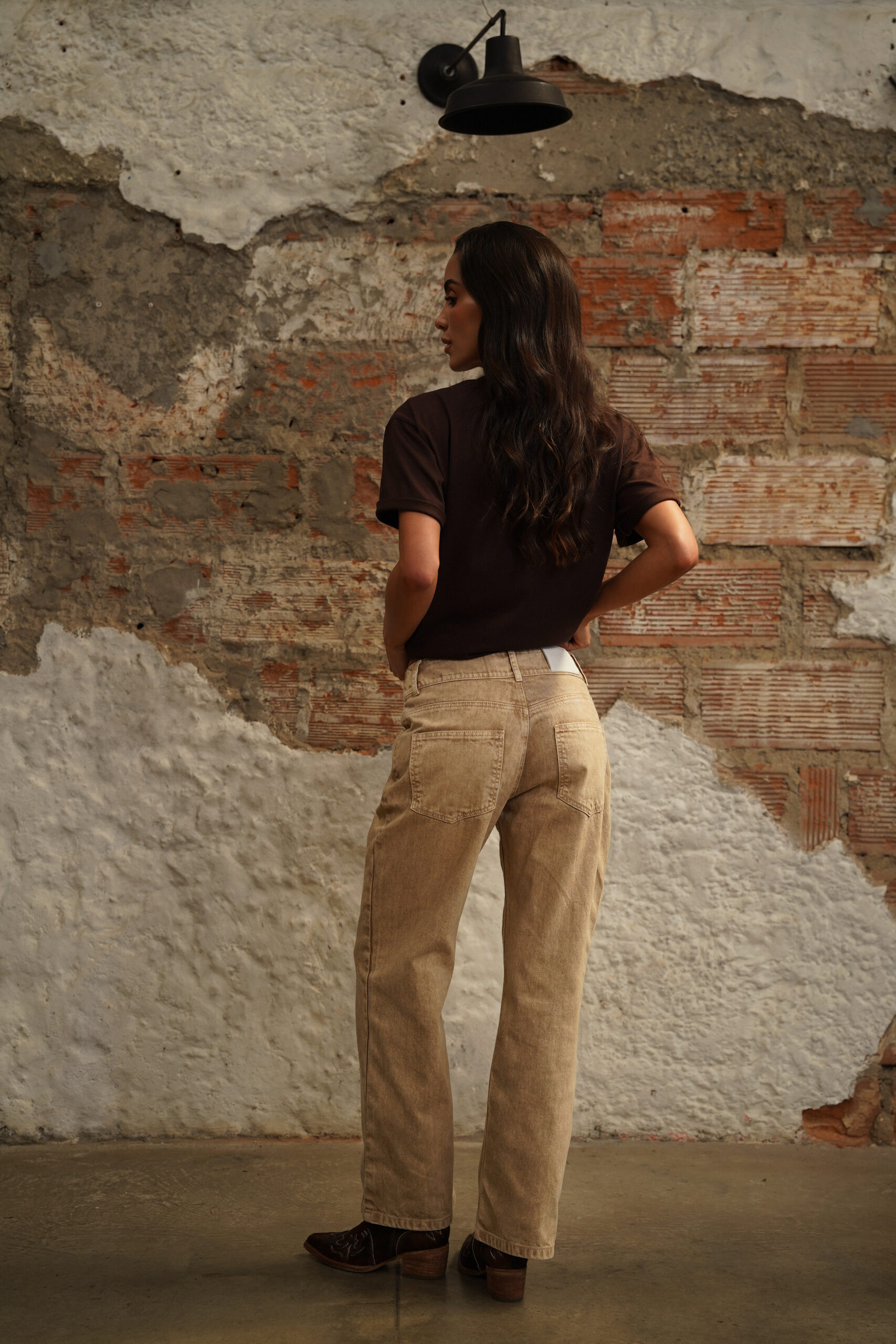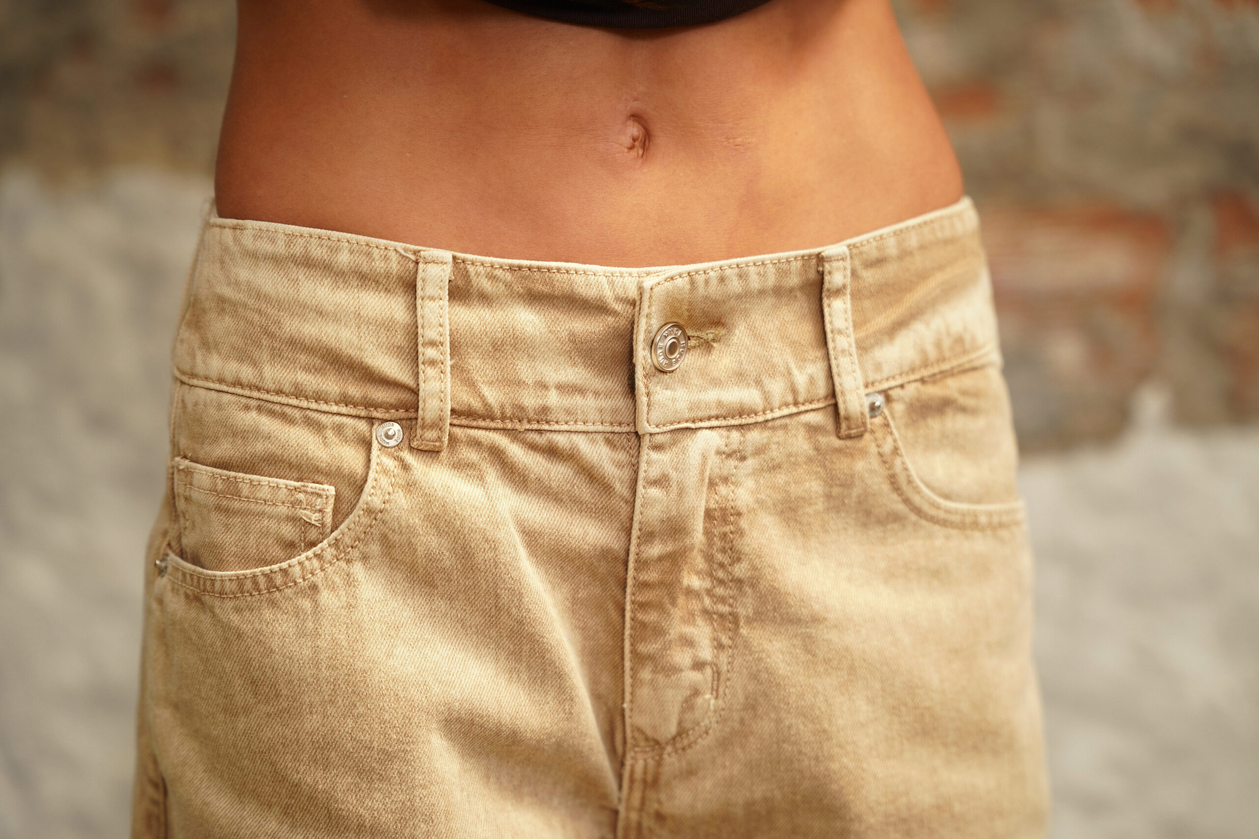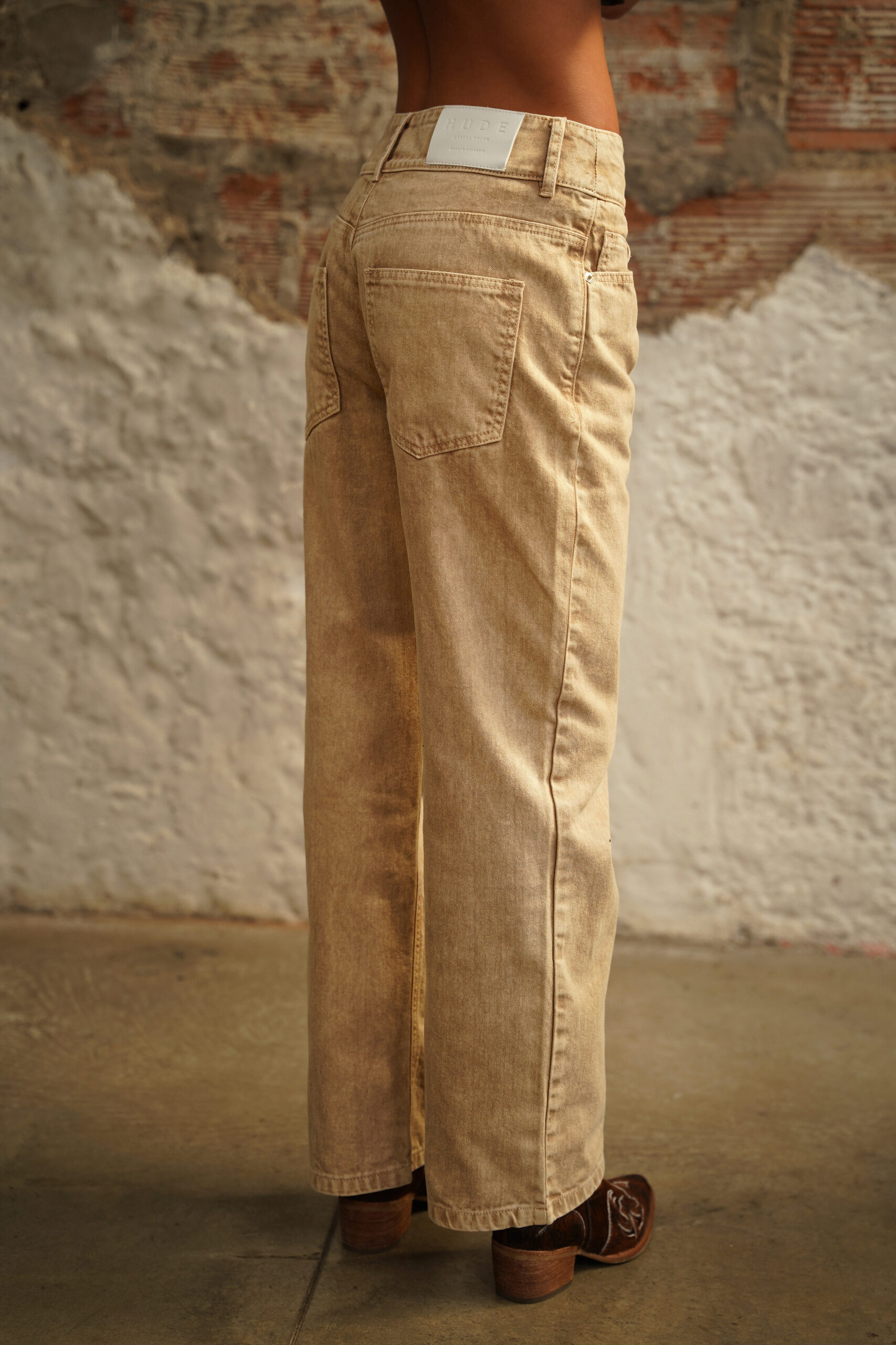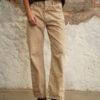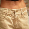 Jean crema de tiro medio, pierna recta con proceso de lavandería overdye, pretina ancha con botón y cierre metálico frontal